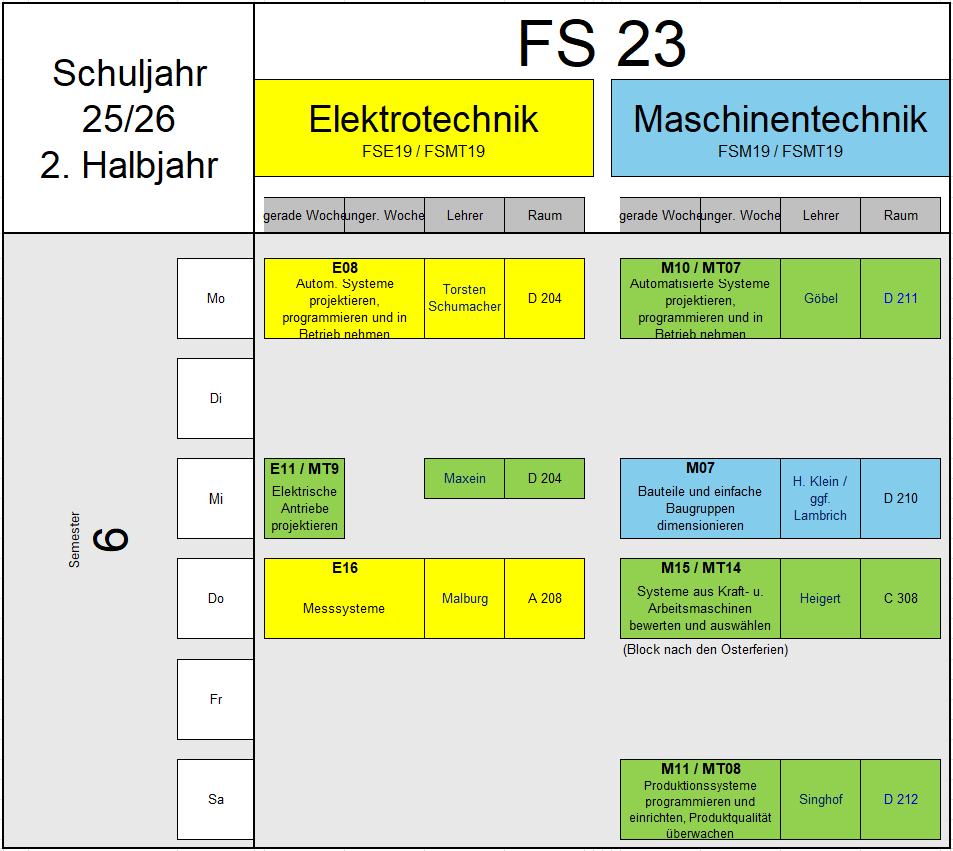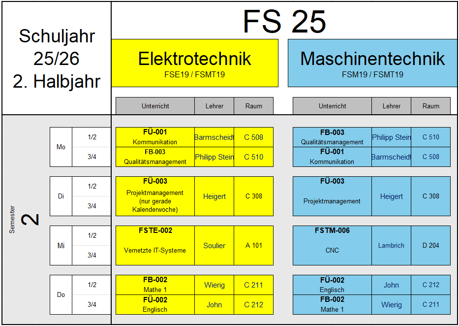 Der Unterricht in der Fachschule für Technik orientiert sich in den naturwissenschaftlichen und sprachlichen Fächern am Hauptschulabschluss, in den beruflichen Fächern an den Kompetenzen, die in der Berufsausbildung vermittelt worden sind.